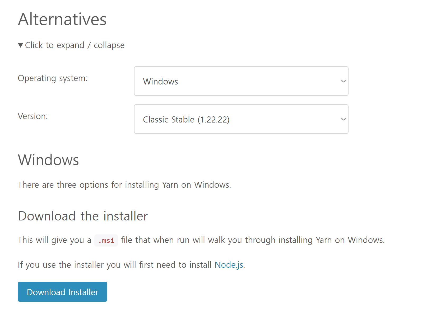 window는 yarn페이지에서 installer를 다운받아 설치. nodejs가 설치되고 나서 설치가 가능하다!!