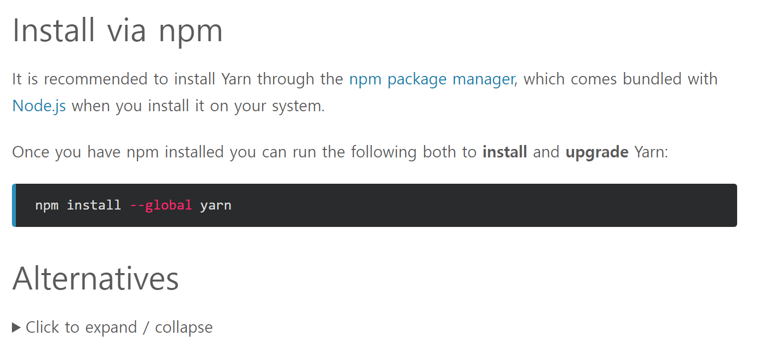 choco install yarn 이라는 명령어를 이용하여 cmd에서도 설치할 수 있다.