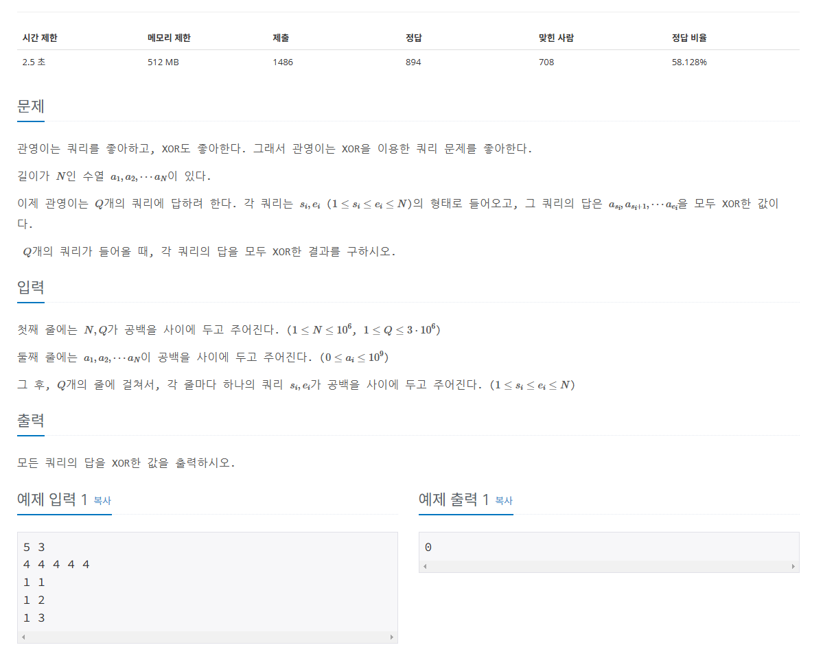 문제를 처음 보고 XOR연산에 대해 잘 모르고 있어서 누적합인지 뭔지도 몰랐다.