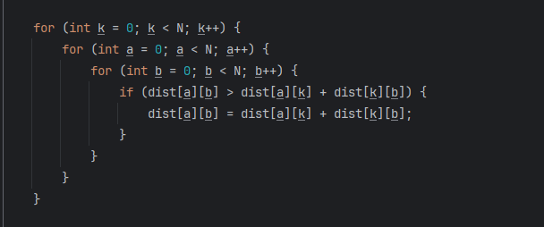 dist[a][b] = Math.min(dist[a][b], dist[a][k] + dist[k][b]);