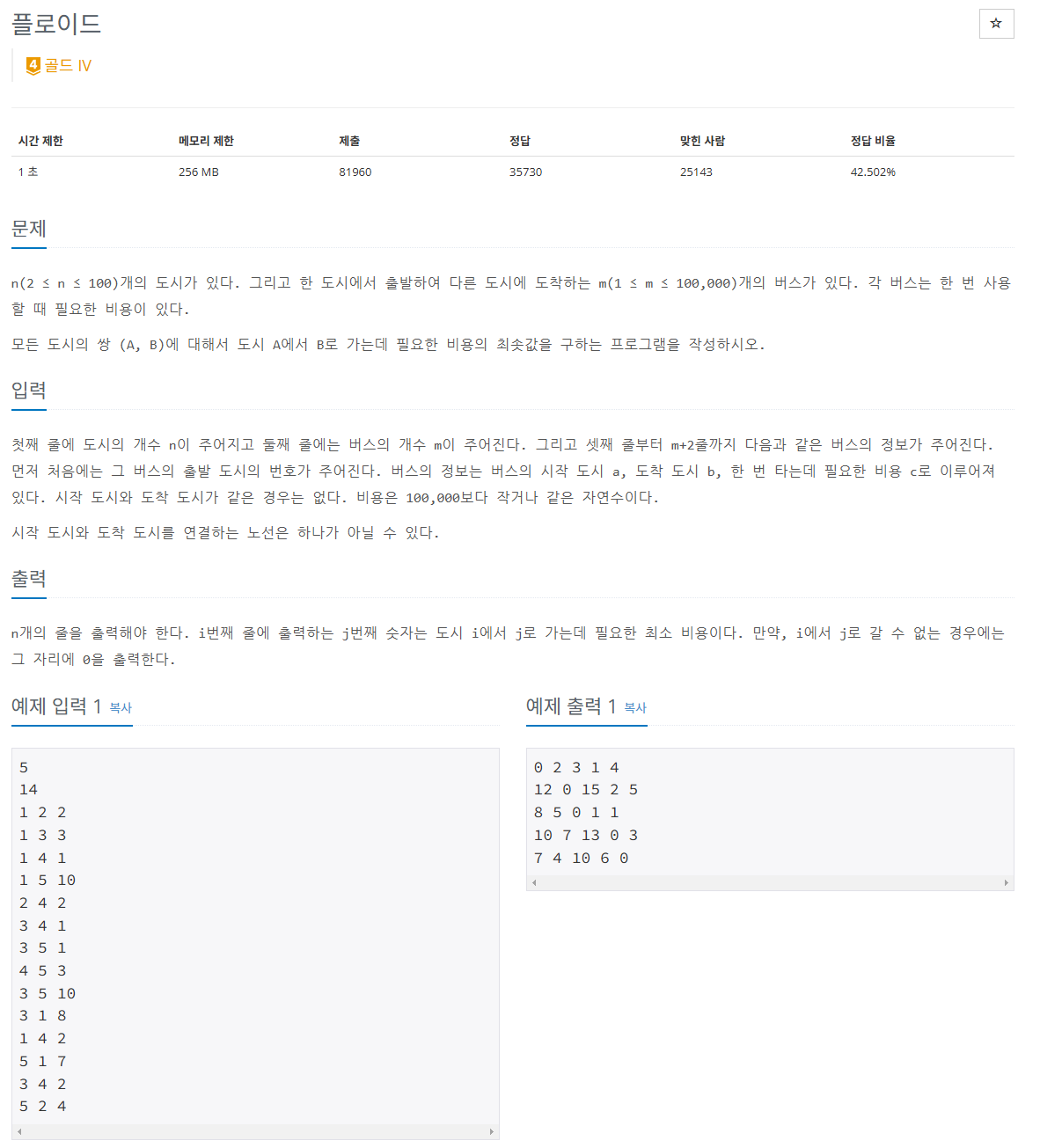 해당 문제는 이름에 대놓고 쓰여있듯이 플로이드-워셜 알고리즘을 이용하여 간단하게 풀 수 있는 문제이다.