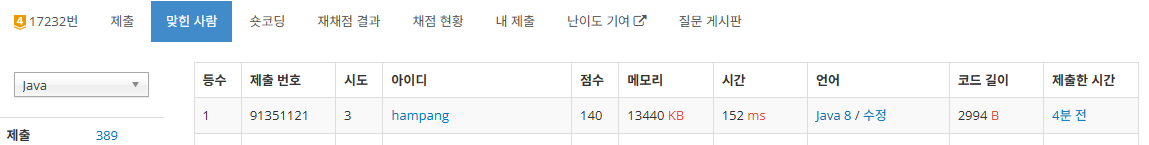 해당 문제 말고도 1등한 코드가 종종 몇개 있는데 누군가 내 풀이 코드를 훔쳐볼 때마다 뿌듯하다 ^.^