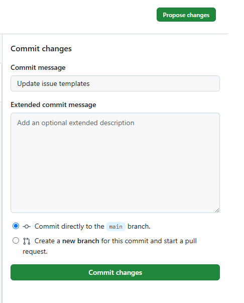 원하는 형식으로 편집 후 오른 쪽 상단에 Propose changes를 누르면 커밋하라는 메세지가 나오고