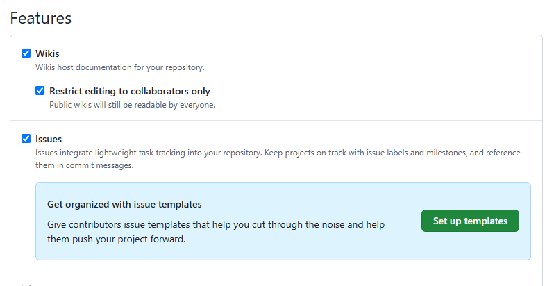 이슈 템플릿은 Settings의 General탭에서 스크롤을 내려 Features -> Issues에 Set up templates가 있다.
