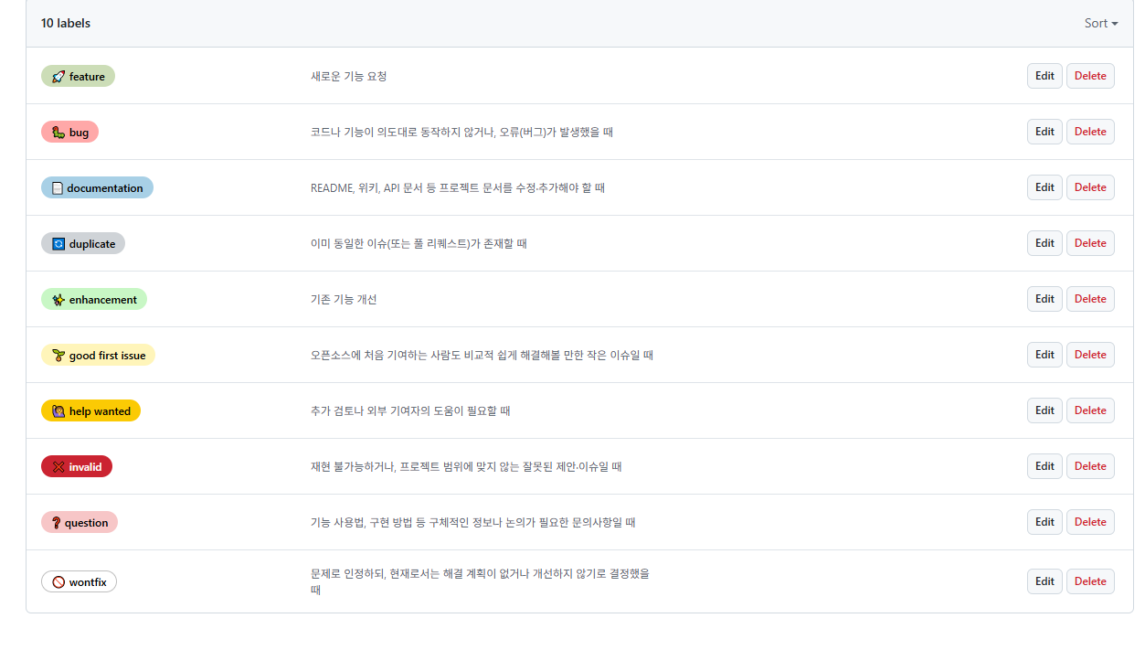github 기본 라벨은 enhancement의 설명에 새로운 기능 추가 + 기본 기능 개선으로 되어있는데