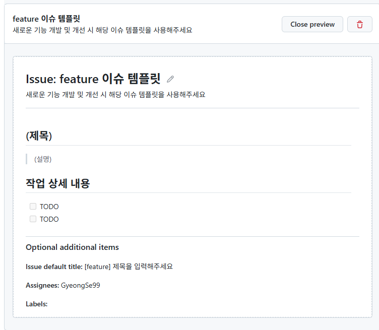 Featue 이슈 템플릿이라면 feature라벨을 태그하기 마련인데 Labels에 feature를 등록하면 내가 따로 입력하지 않아도