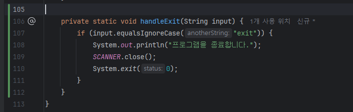나는 정상적으로 프로그램을 종료했다(코드 0)는 의미를 넣고 싶었고, 메소드 분리를 한 상태라서 메소드 사이사이 중단을 해줘야하는 상황이었기 때문에 반복문을 break하지 않고 exit입력 시