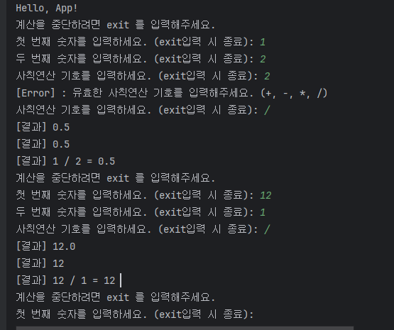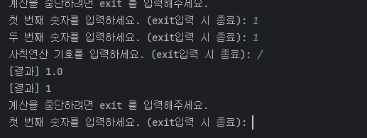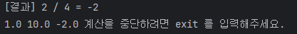 System.out.println("계산을 중단하려면 exit 를 입력해주세요.");